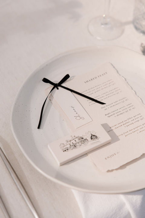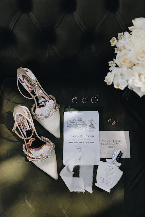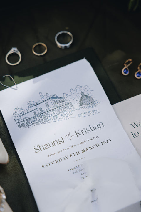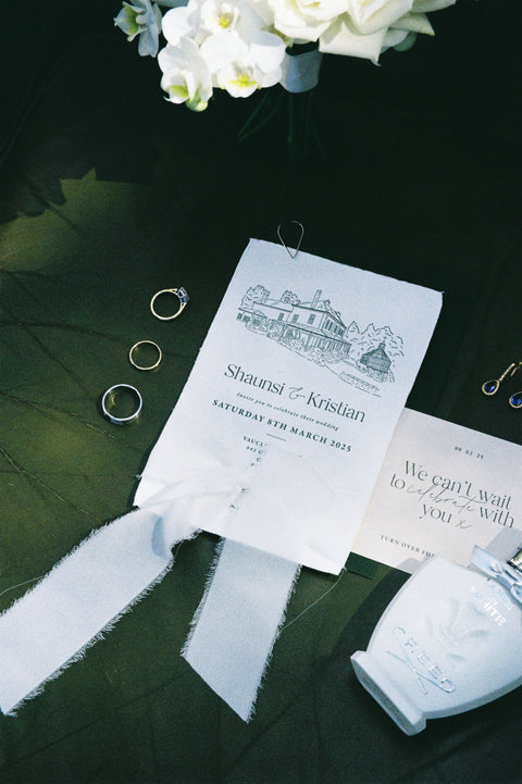 From the very beginning, every detail was designed to set the tone. Their invitations were a work of art: white handmade paper, finished with green letterpress. Soft, textural, and oh-so elegant, the suite hinted perfectly at the magic to come.