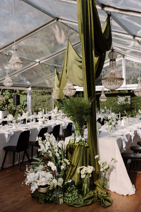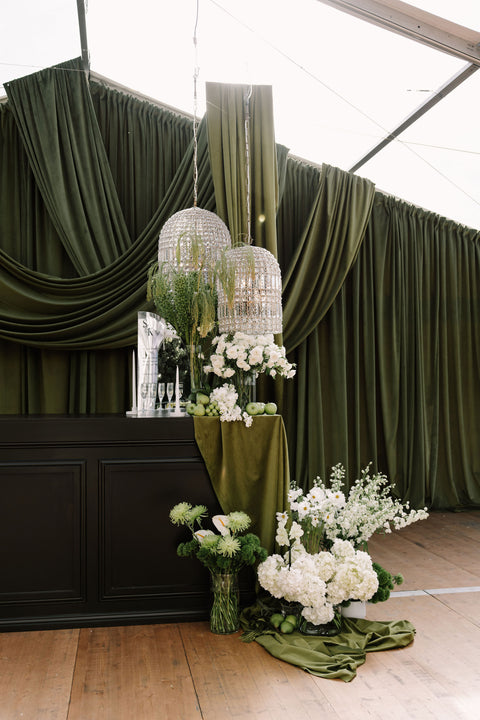 Stepping into the marquee was like walking into a world of romance and grandeur. Olive velvet drapery framed the entrance, cascaded from the ceiling, and even adorned the welcome sign, creating an atmosphere of depth and luxury. Sparkling chandeliers, an abundance of lush white and green florals, and decadent styling details — think grapes, pears, and apples scattered across the tablescape — made for a setting that was equal parts lavish and inviting.