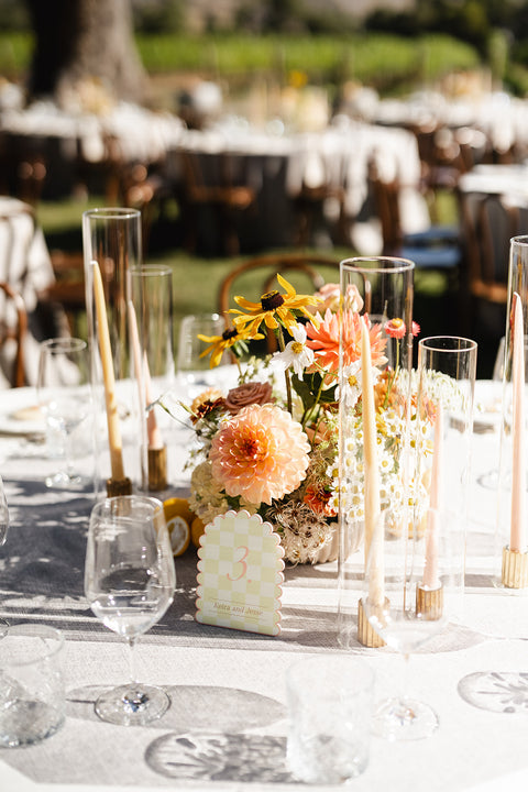 One of the standout elements was the custom scallop shape we created for them. This playful motif made an appearance throughout the day – from the curved edges of their welcome sign and bar signage, to the scalloped arch-shaped table numbers and their show-stopping seating chart. We even designed bespoke scalloped placemats for each guest’s setting, adding a fun and unexpected detail to the tablescape that tied everything together beautifully.